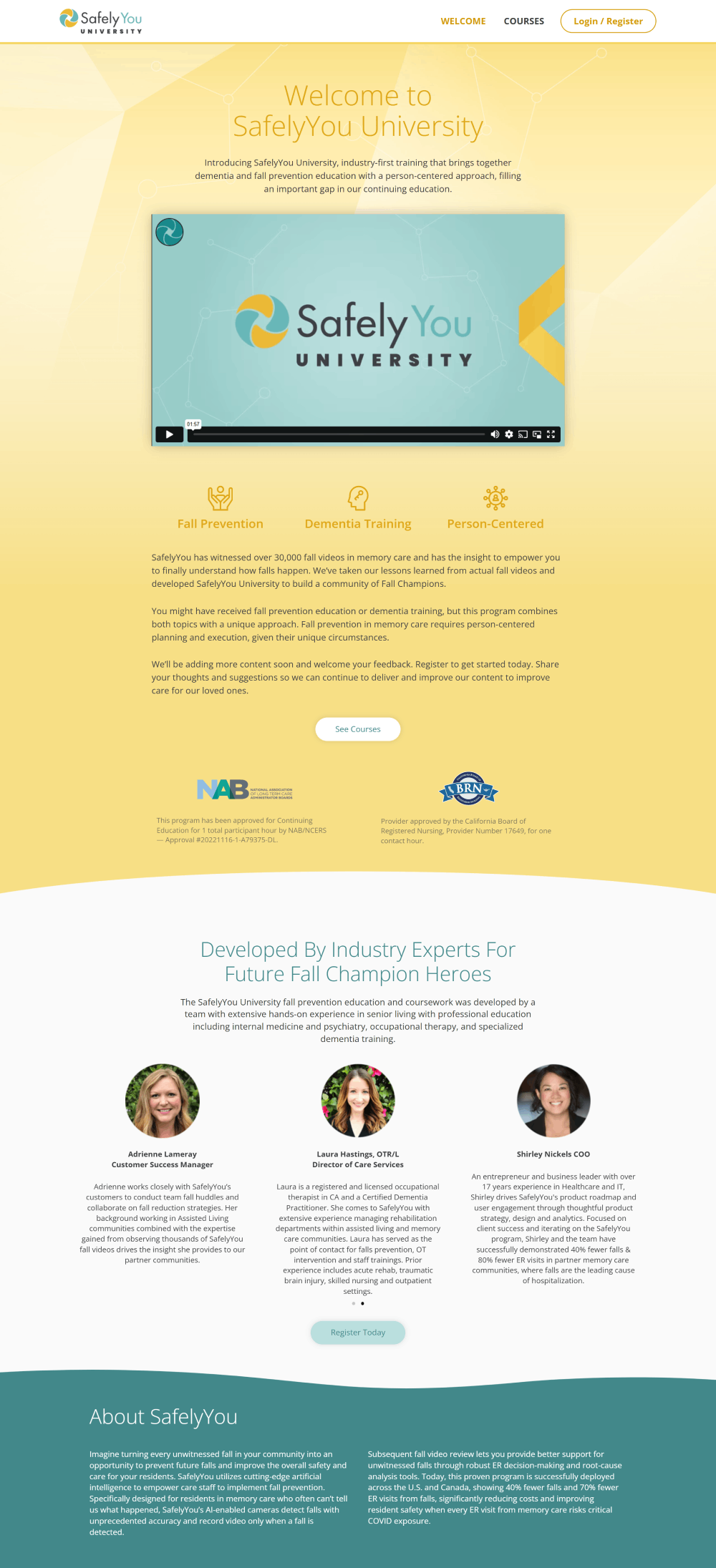 SafelyYou University is an educational platform designed to provide training in fall prevention and dementia care for healthcare professionals and senior living communities. The platform combines practical insights, real-world data, and person-centered care approaches to improve safety and care quality.